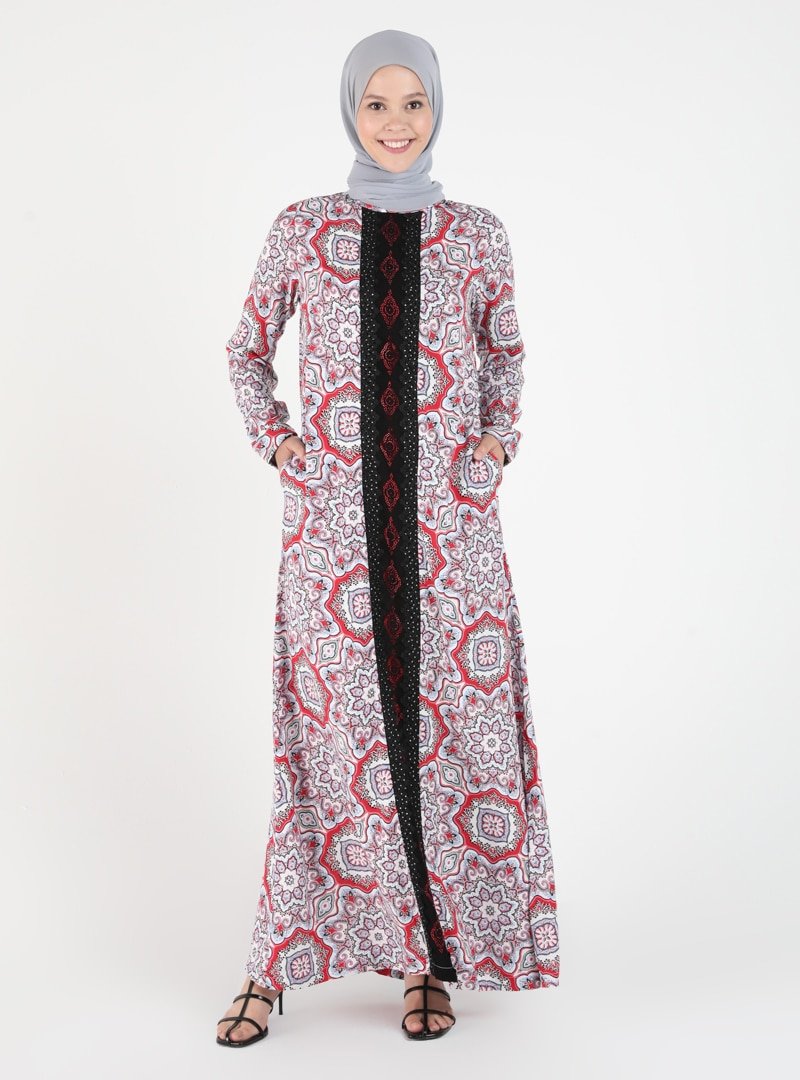 Ginezza Kırmızı Dantel Detaylı Desenli Elbise