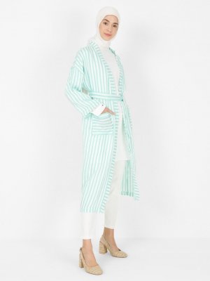İLMEK TRİKO Çağla Beyaz Cep Detaylı Kuşaklı Kimono