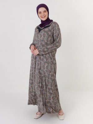 GELİNCE Mürdüm Desenli Drop Detaylı Elbise