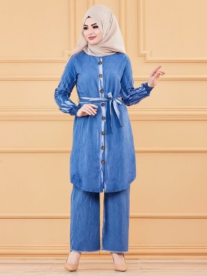 Tofisa İndigo Düğmeli Kuşaklı Tunik