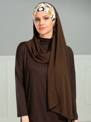 Ayşe Türban Tasarım Desenli Kahverengi Penye Boneli Şifon Şal