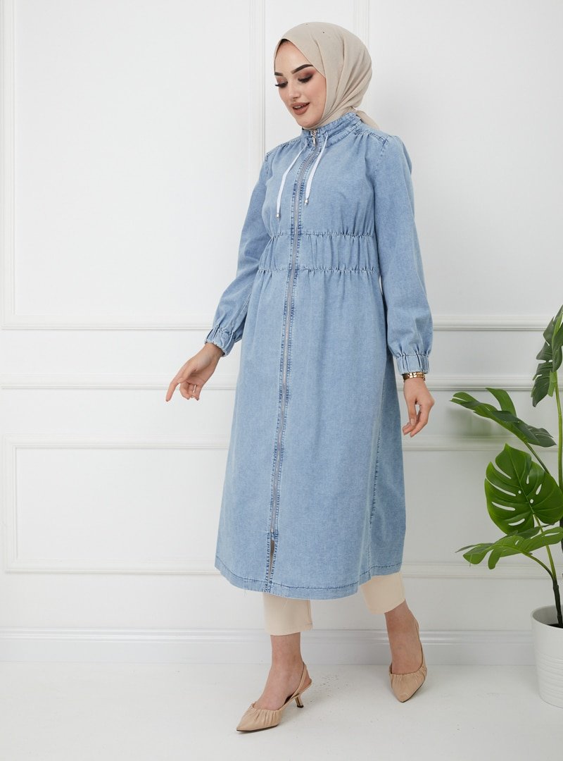 Olcay Mavi Beli Büzgülü Fermuarlı Astarsız Denim Kot Kap