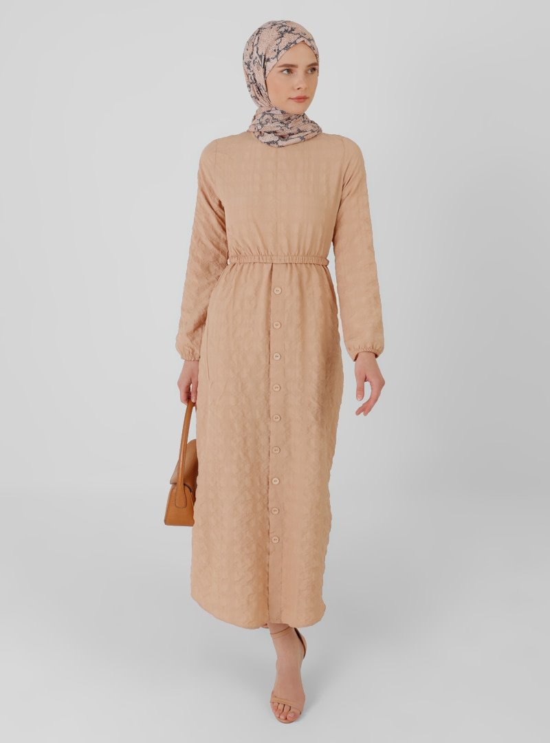 BÜRÜN Camel Beli Lastikli Düğme Detaylı Elbise