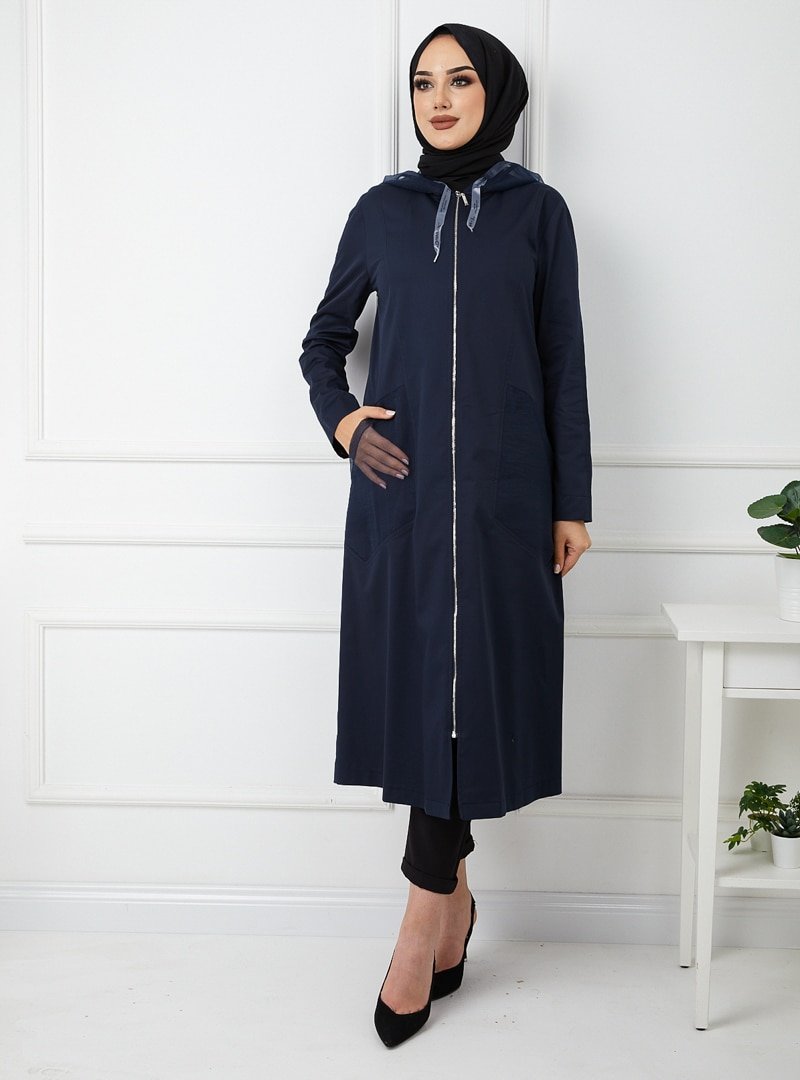 Olcay Lacivert Organze Kapüşonlu Astarsız Kap