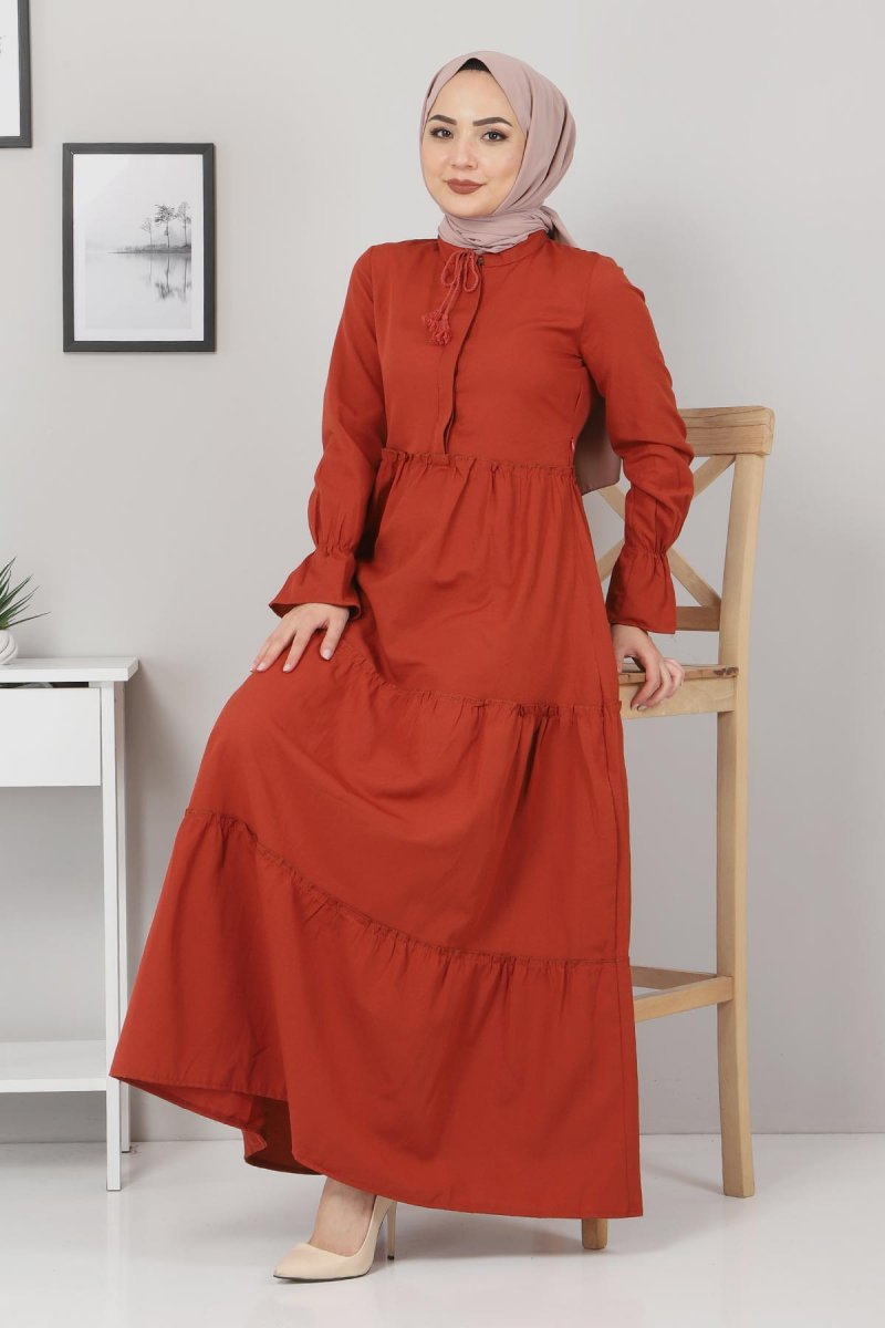 Tesettür Dünyası Kiremit Pileli Kolları Lastikli Elbise