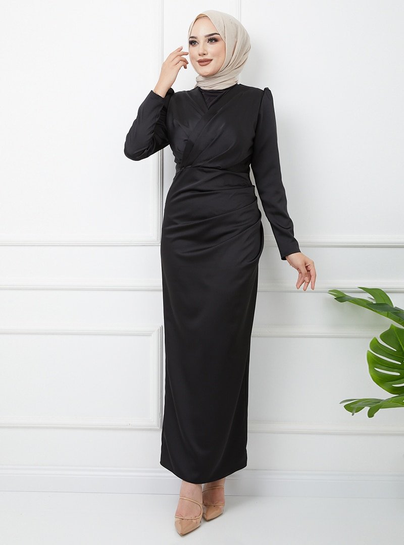 Olcay Siyah V Yaka Pile Detaylı Saten Abiye Elbise