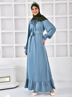 Tuncay Mint Saten Kumaş Reglan Kol Fırfırlı Elbise