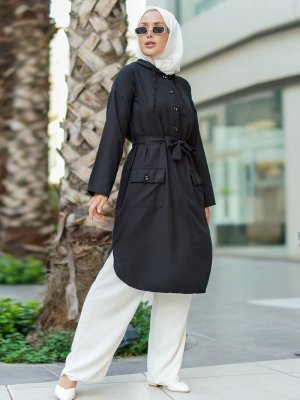 Por La Cara Siyah Düğmeli İki Cepli Kapüşonlu Uzun Tunik