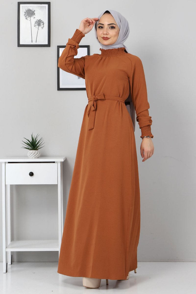 Tesettür Dünyası Taba Yakası Lastikli Elbise