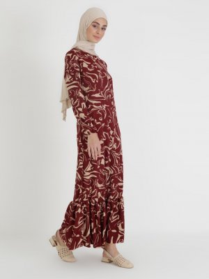 Moda Zenis Krem Bordo Çiçek Desenli Elbise