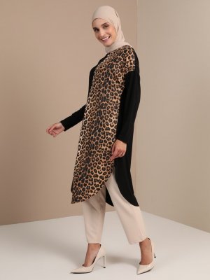Tavin Siyah Leopar Desenli Asimetrik Kesim Tunik