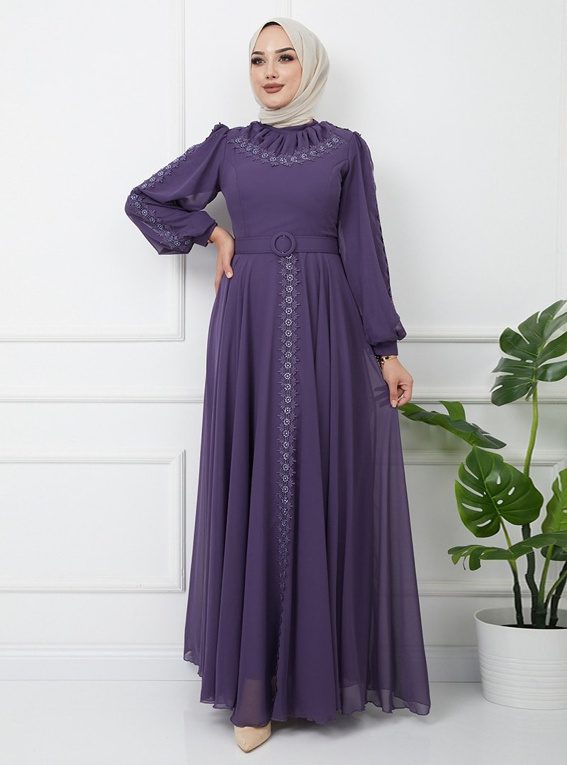 Olcay Açık Mor Yakası Büzgülü Dantel Detaylı Kemerli Abiye Elbise