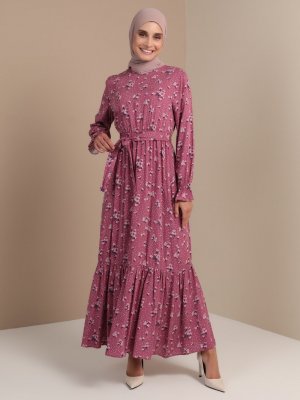 Tavin Koyu Gül Kurusu Doğal Kumaşlı Beli ve Kol Uçları Lastikli Elbise