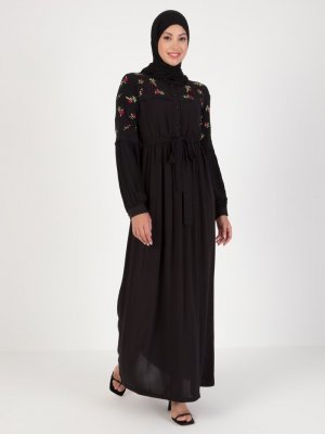 Ginezza Siyah Çiçek Desenli Nakışlı Elbise