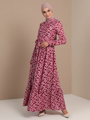 Tavin Fuşya Yakası Fermuarlı Kuşaklı Elbise