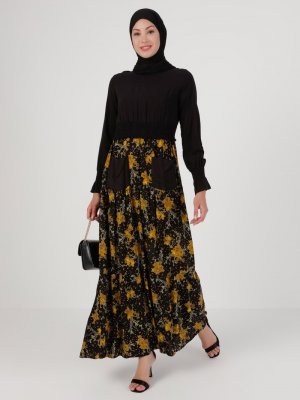 Ginezza Hardal Beli Lastikli Desenli Elbise