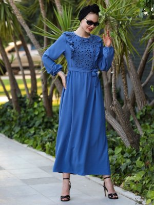 Selma Sarı Design Mavi Lazer Kesim Detaylı Beli Büzgülü Elbise