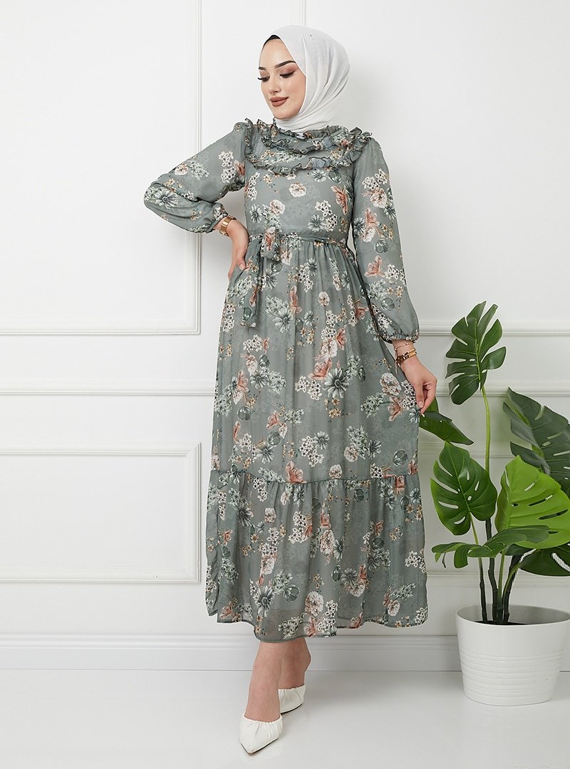 Olcay Haki Yaka ve Robası Fırfır Detaylı Çiçekli Elbise