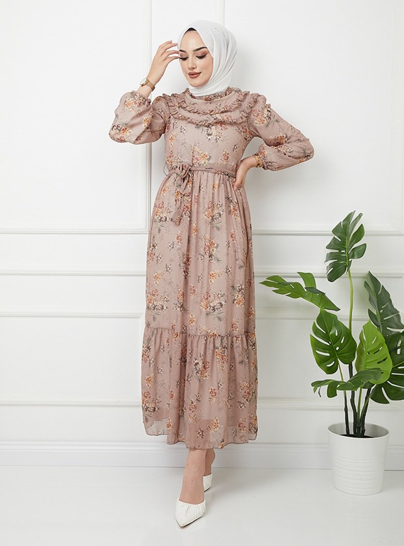 Olcay Vizon Yaka ve Robası Fırfır Detaylı Çiçekli Elbise