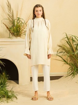 Ceylan Otantik Krem Müslin Büzgü Detaylı Tunik