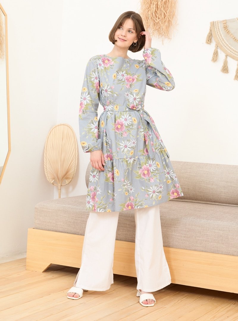 Ceylan Otantik Soft Gri Çiçekli kat Kat Tunik