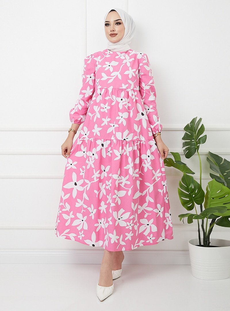 Olcay Pembe Büzgülü Çiçek Desenli Poplin Elbise