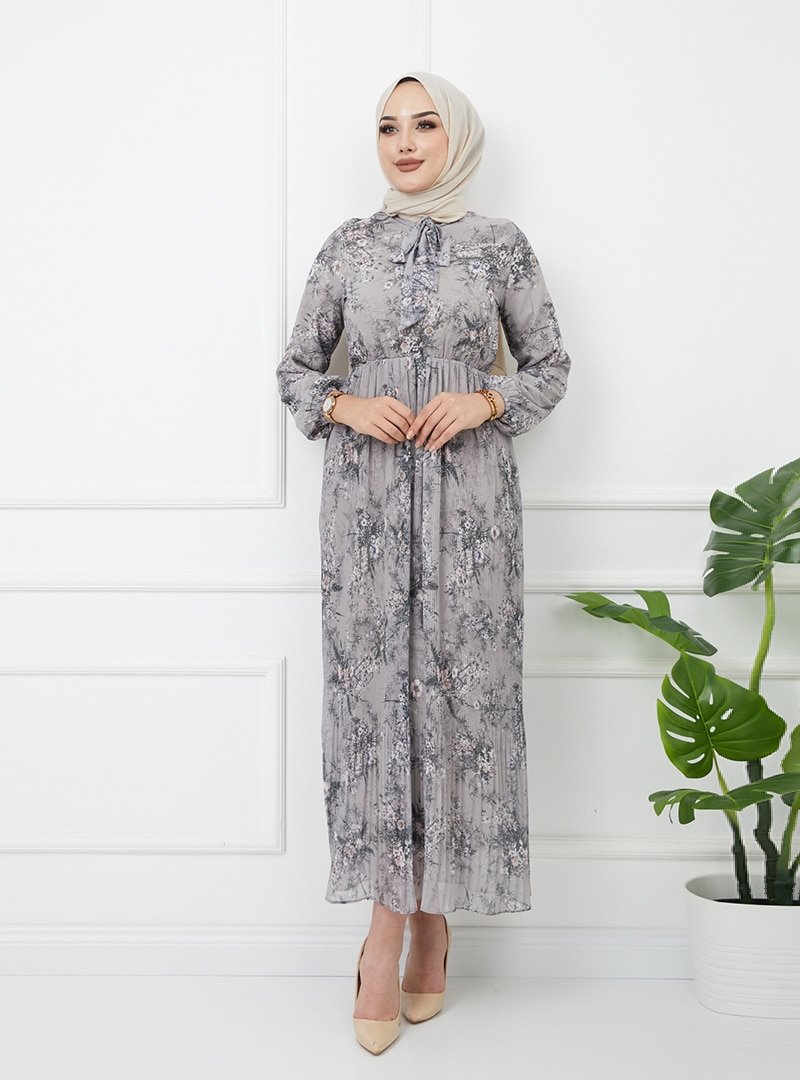 Olcay Gri Eteği Pilise Detaylı Çiçekli Elbise