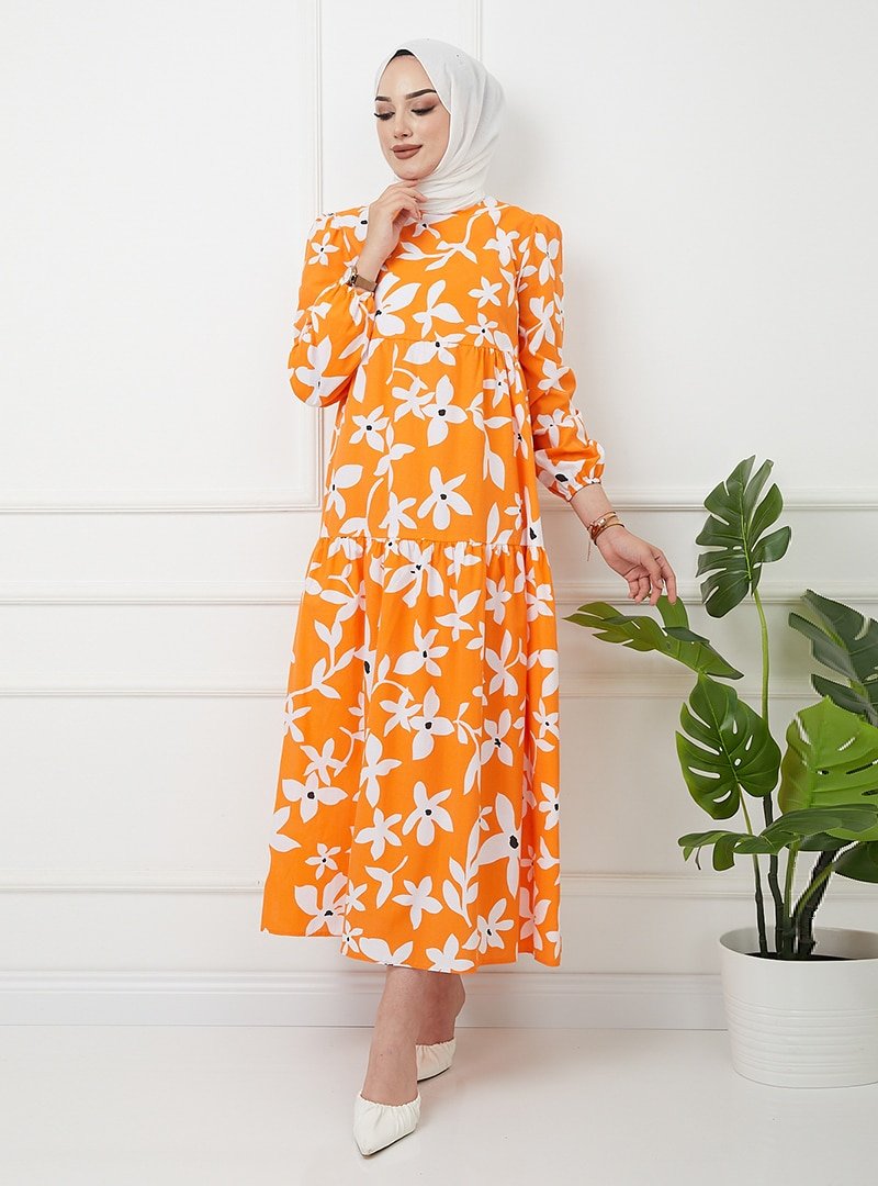Olcay Oranj Büzgülü Çiçek Desenli Poplin Elbise