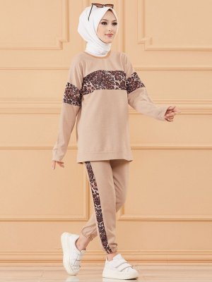 Tofisa Bej Leopar Desenli Tunik&Pantolon İkili Takım