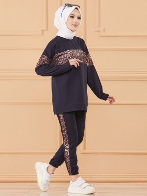 Tofisa Lacivert Leopar Desenli Tunik&Pantolon İkili Takım