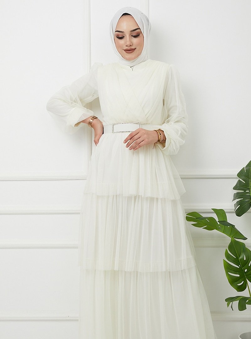 Olcay Ekru Kemeri Taş Detaylı Tüllü Kat Kat Abiye Elbise