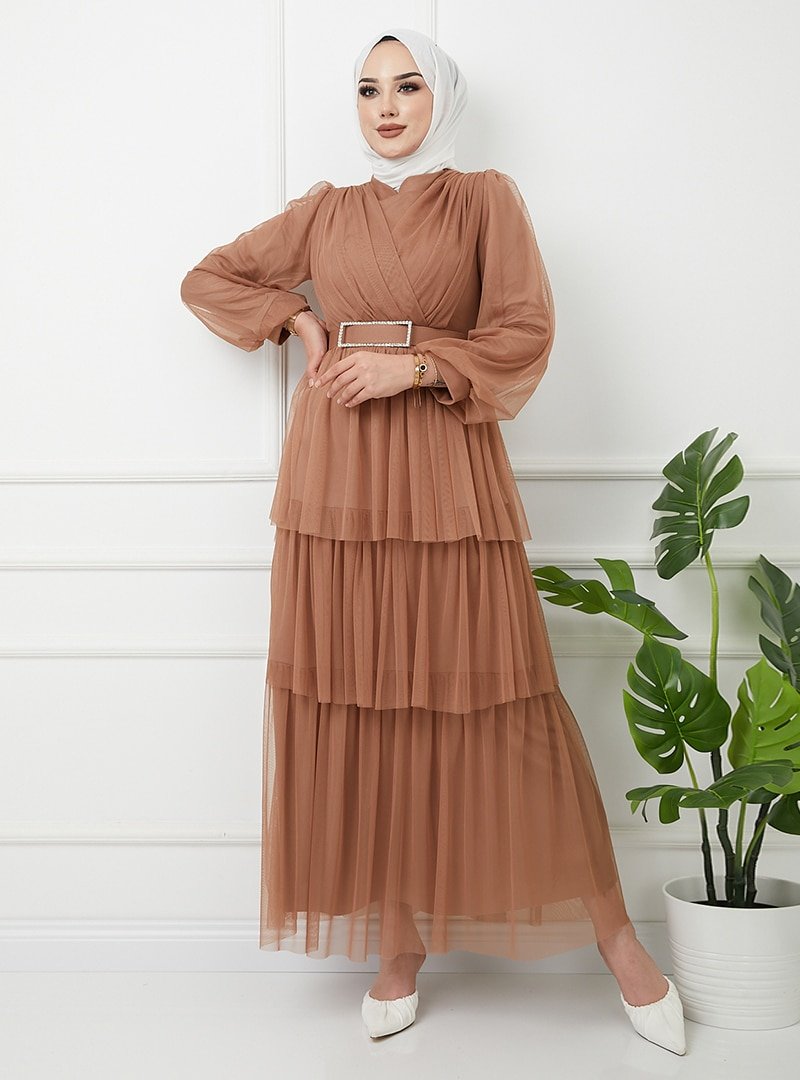 Olcay Taba Kemeri Taş Detaylı Tüllü Kat Kat Abiye Elbise