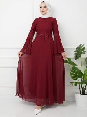 Olcay Bordo Taş Ve İnci Detaylı Abiye Elbise