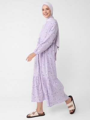 Benin Lila Doğal Kumaşlı Çiçek Desenli Elbise