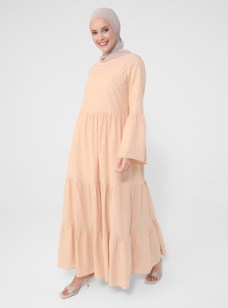 Refka Pudra Nakış Detaylı Kat Kat Kesimli Pamuk Elbise