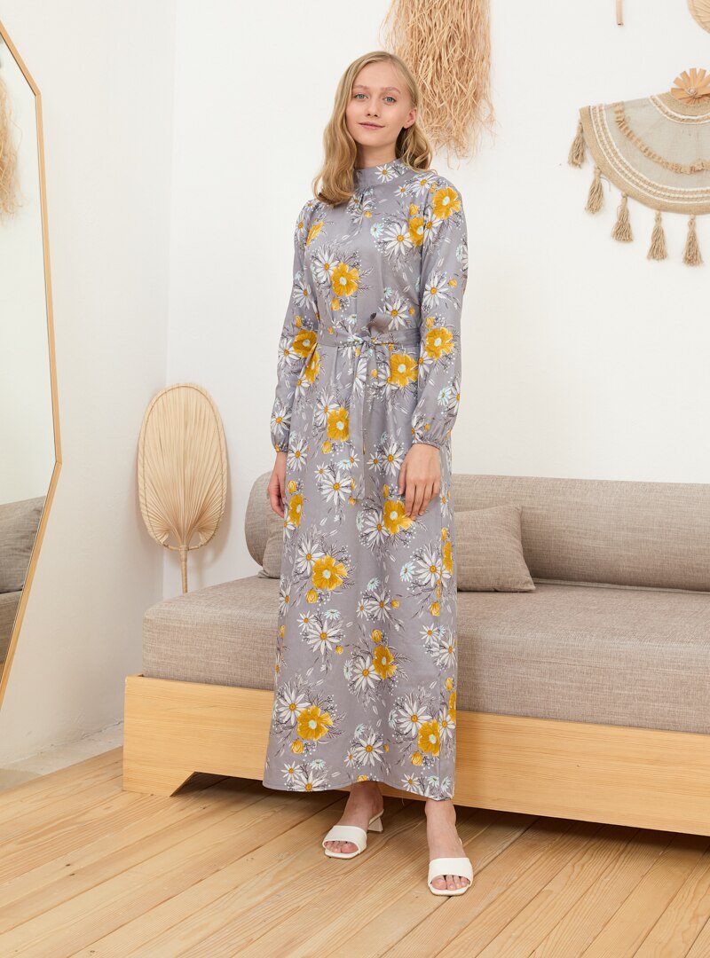 Ceylan Otantik Hardal Gri Çiçekli Büzgü Detay Elbise