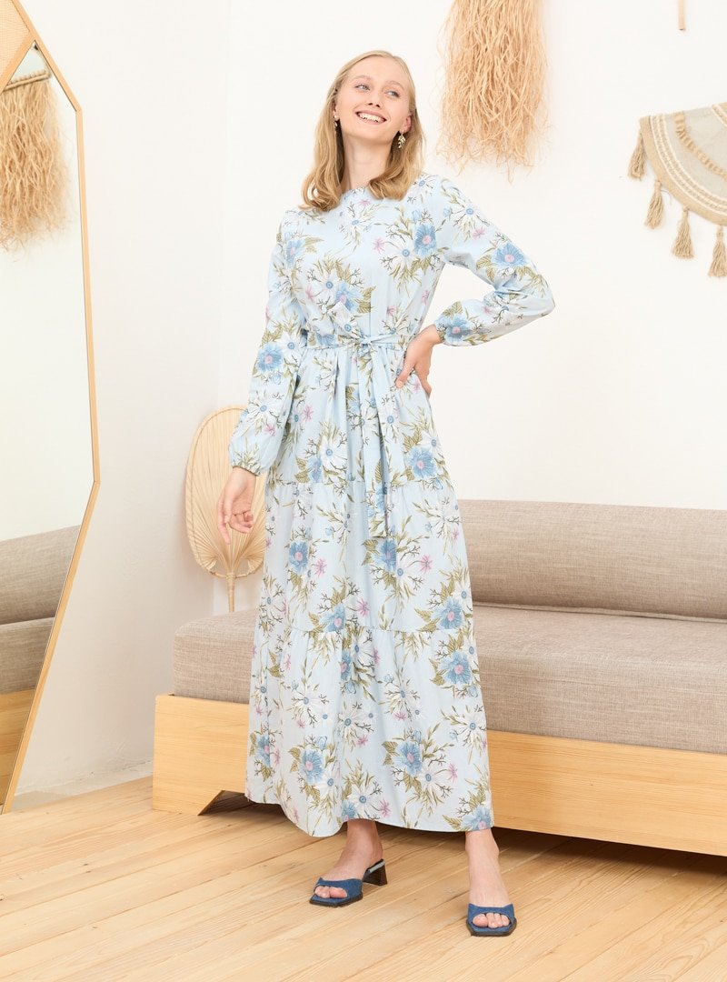 Ceylan Otantik Soft Mavi Çiçekli Kat Kat Elbise