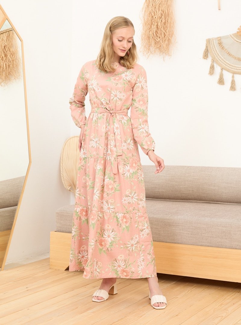 Ceylan Otantik Yavruağzı Çiçekli Kat Kat Elbise