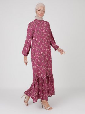 BÜRÜN Mürdüm Etek Uçları Fırfırlı Desenli Elbise