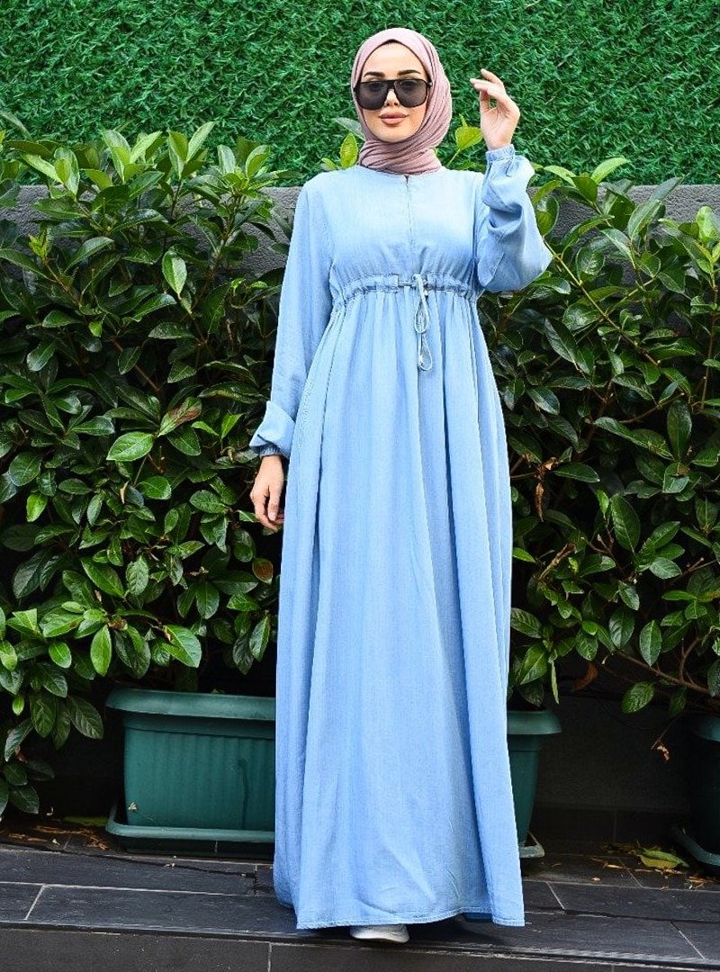 Neways Mavi Tensel Belden Büzgülü Elbise
