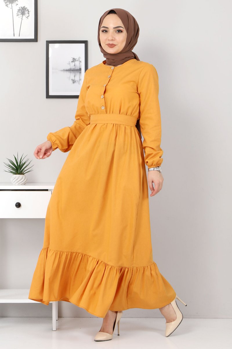 Tesettür Dünyası Hardal Eteği Volanlı Elbise