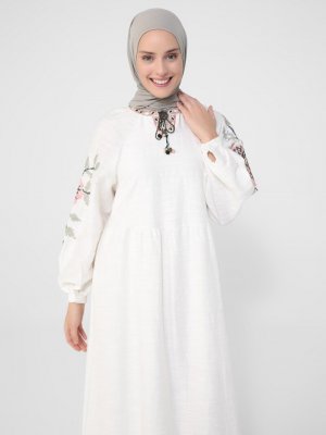 Refka Ekru Yaka Ve Kol Etamin Nakış Detaylı Saten Tuşeli Elbise