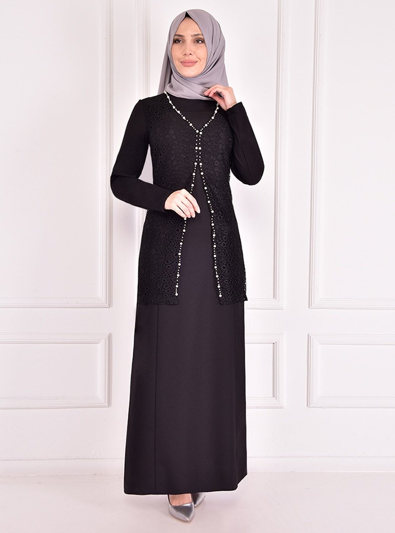 AYŞE MELEK TASARIM Siyah İnci Dantelli Abiye Elbise