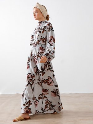 Phull Gri Çiçek Desenli Gipeli Elbise