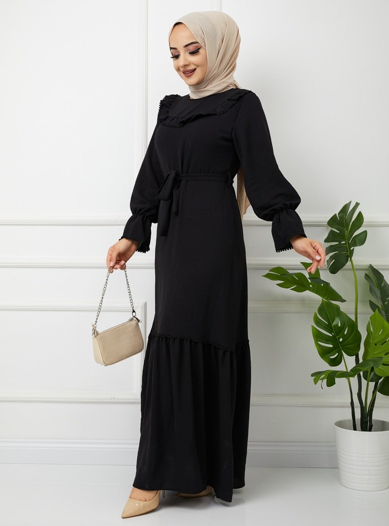 Olcay Siyah Büzgü ve Fırfır Detaylı Dantel Şeritli Elbise