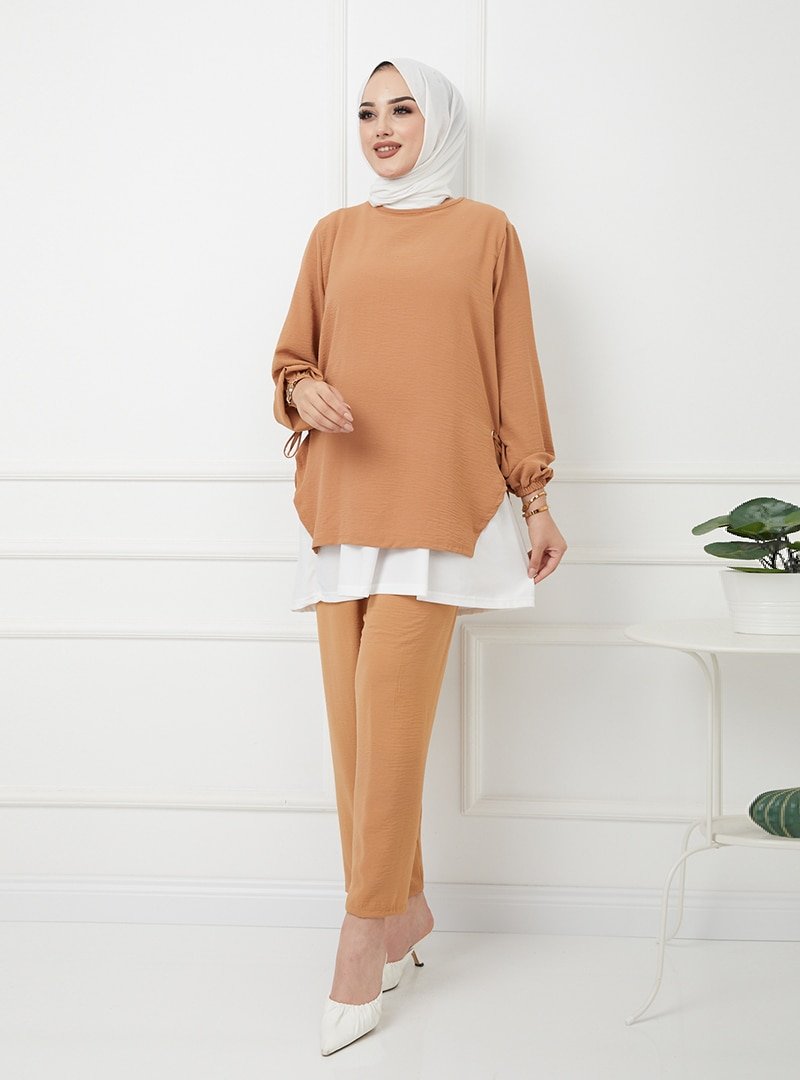 Olcay Camel Yandan Bağcıklı Üç Parça Pantolonlu Takım