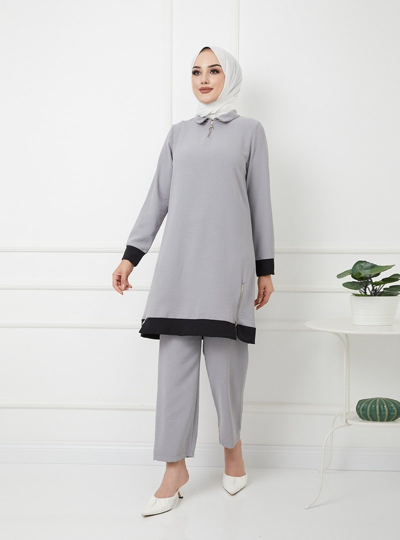 Olcay Gri İki Renkli Fermuar Detaylı Pantolon Tunik Takım