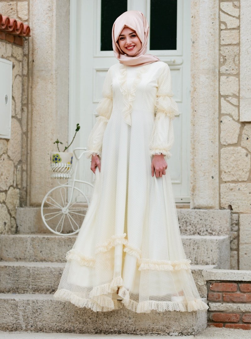 Lavienza Ekru Petek Dantel Abiye Elbise