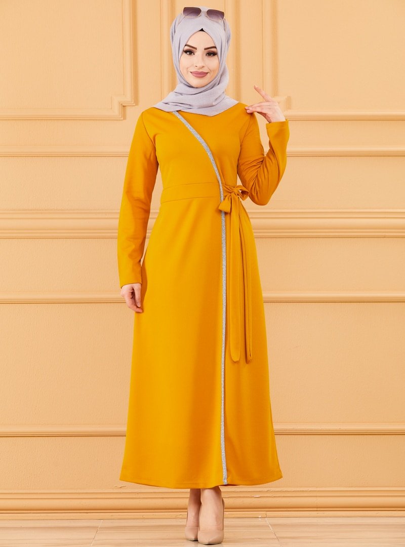 Tofisa Hardal Sim Şerit Detaylı Elbise