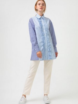 Touche Prive Mavi Fırfırlı Çizgili Poplin Gömlek
